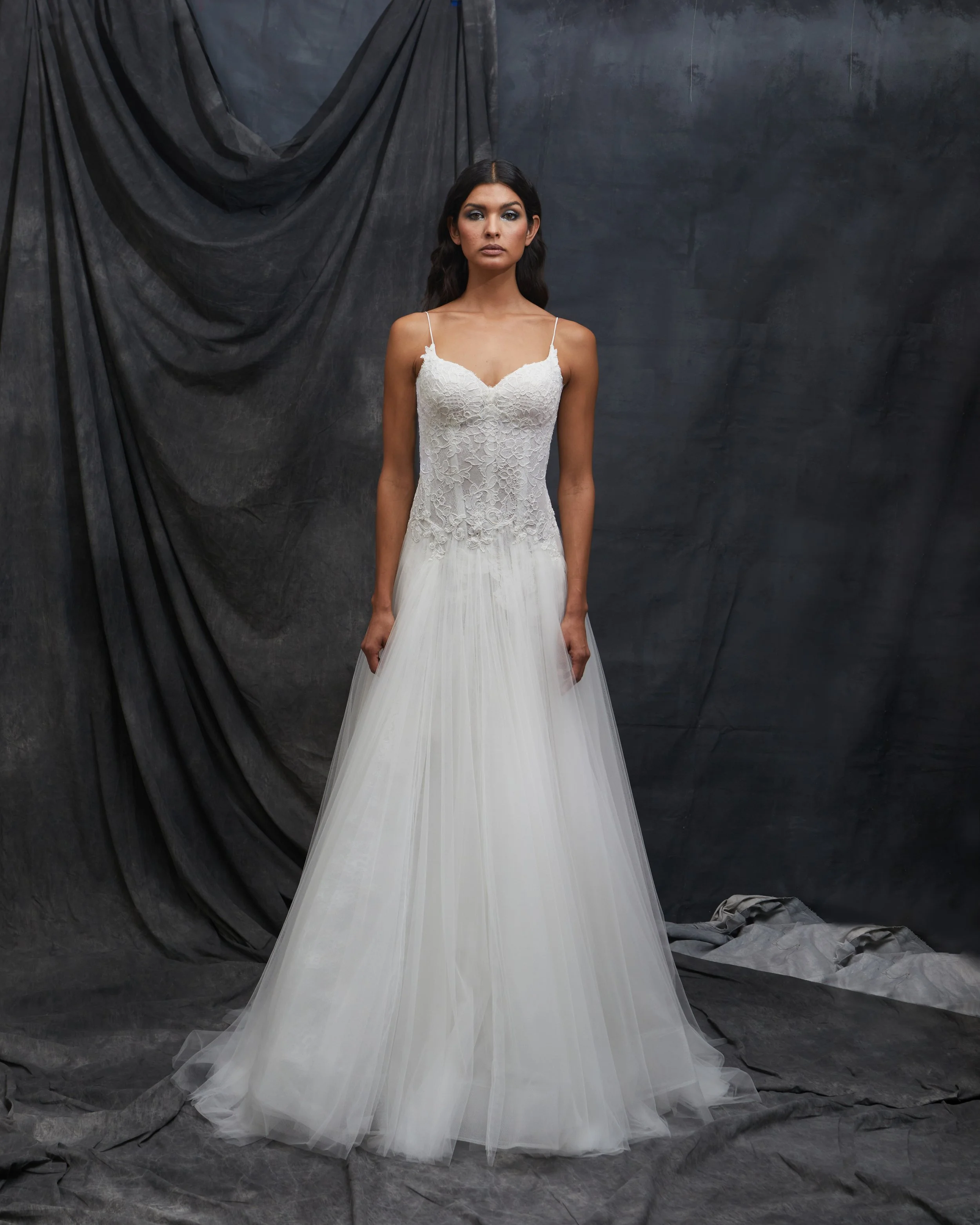 Corded lace appliqué low-back bustier gown with seamlessly transitioning tulle skirt paired with matching lace bolero. Corded lace appliqué low-back bustier gown with seamlessly transitioning tulle. Slide 1 Slide 1 (current slide) Slide 2 Slide 2 (current slide)