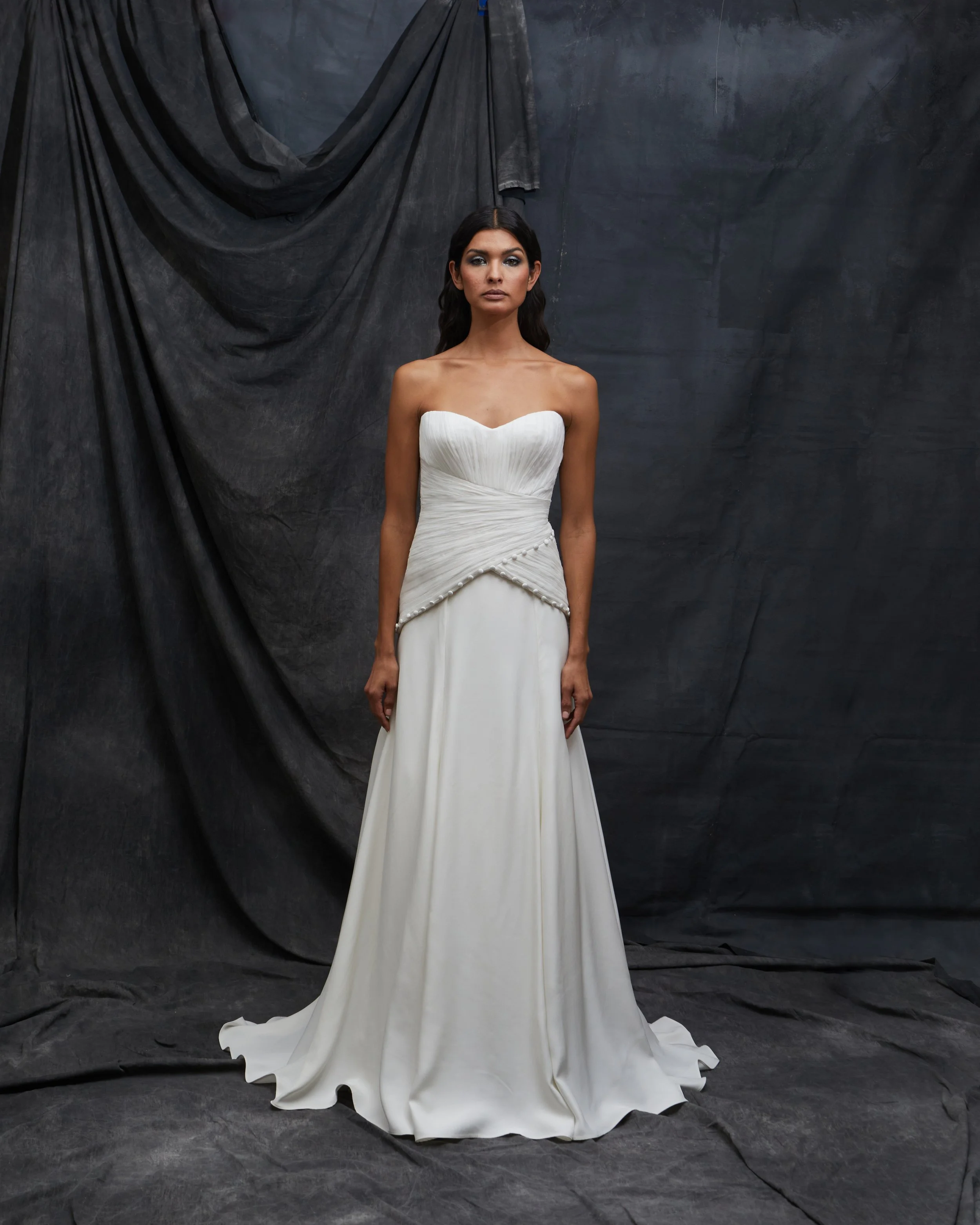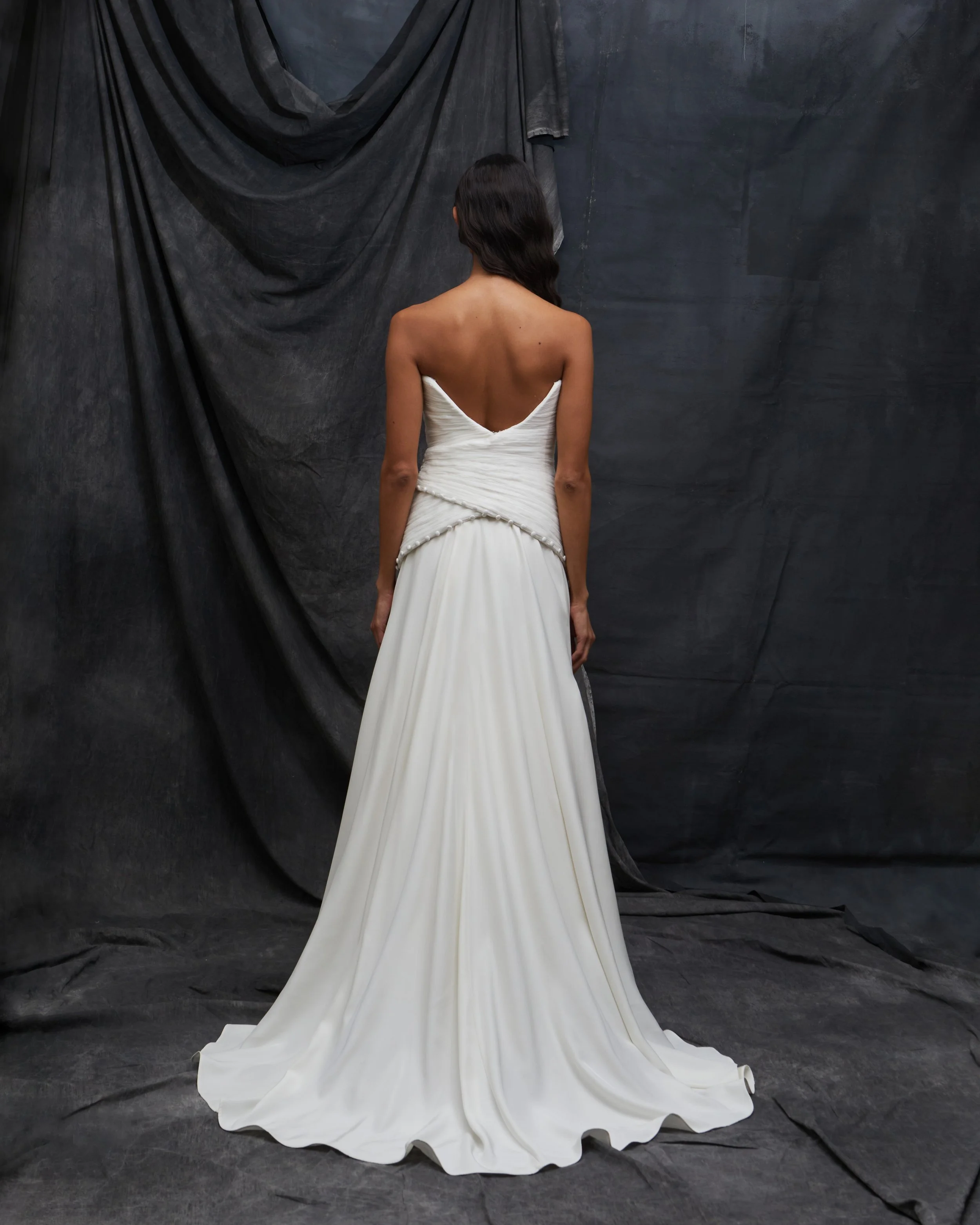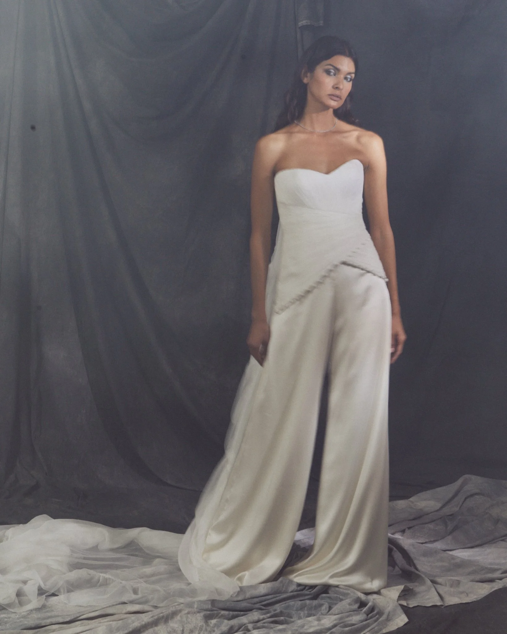 Hand-Draped crinkled silk chiffon asymmetrical bustier paired with silk charmeuse wide-leg pants. Hand-Draped crinkled silk chiffon asymmetrical bustier paired with silk crepe skirt. Hand-Draped crinkled silk chiffon asymmetrical bustier paired with silk crepe skirt. Slide 1 Slide 1 (current slide) Slide 2 Slide 2 (current slide) Slide 3 Slide 3 (current slide)