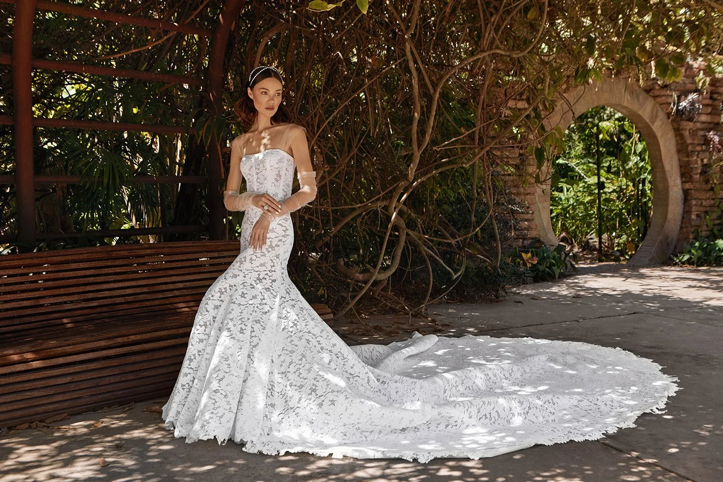 Straight neckline Spanish lace seamless gown with hidden separating zipper underskirt for detachable 3 yd train featuring built-in corset and Italian tulle straps and forearms sleeves. Slide 1 Slide 1 (current slide)