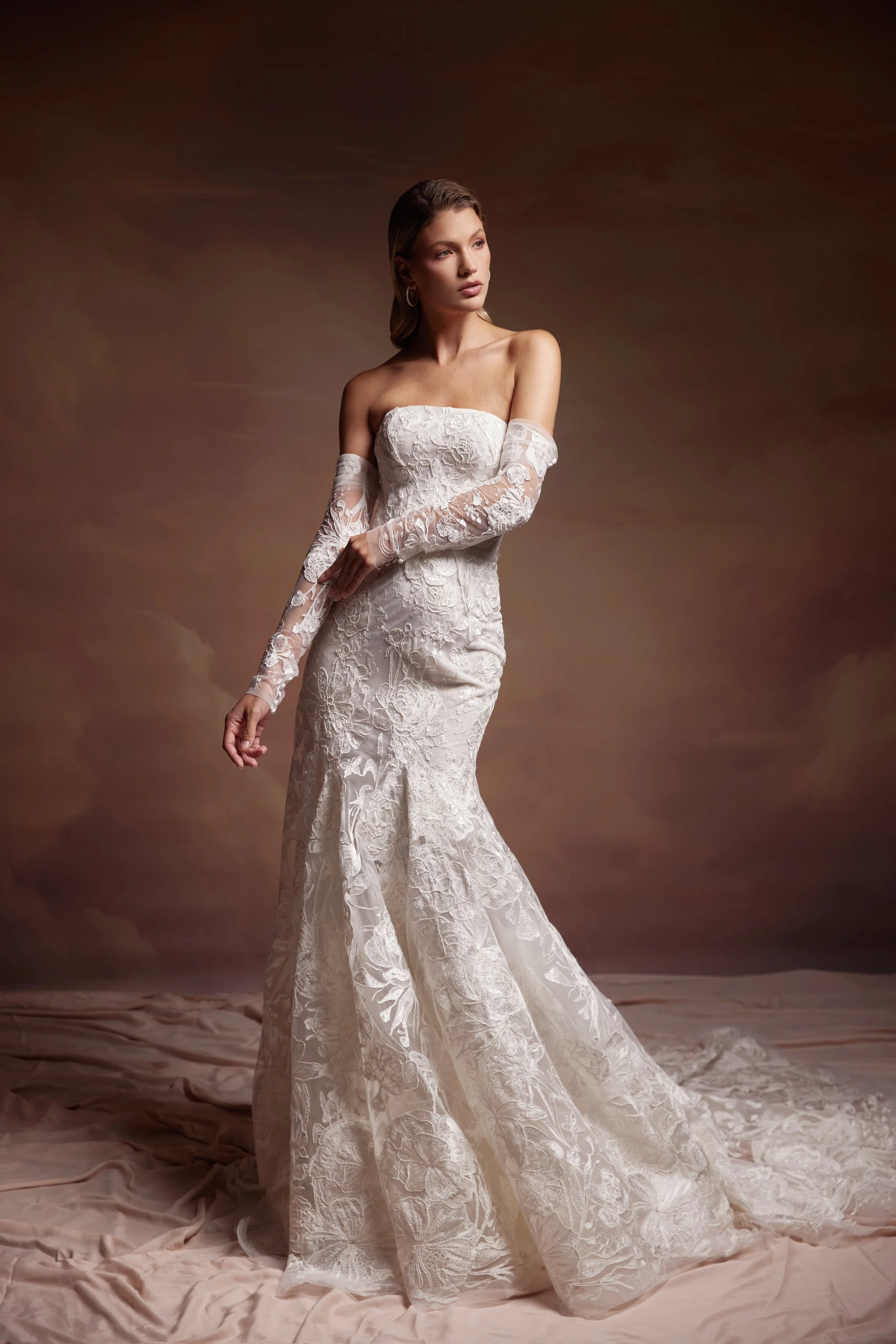 Strapless fit and flare gown with corded floral lace seamless appliqué. Tulle gloves with corded floral appliqués. Slide 1 Slide 1 (current slide) Slide 2 Slide 2 (current slide)