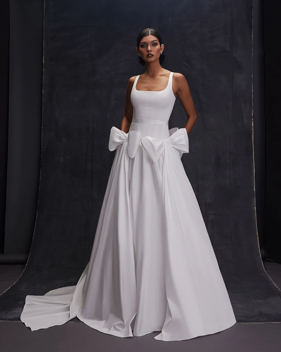 Recycled taffeta drop waist gown with square neckline, straps, and pockets and removable taffeta bows with floor length laces. Slide 1 Slide 1 (current slide)